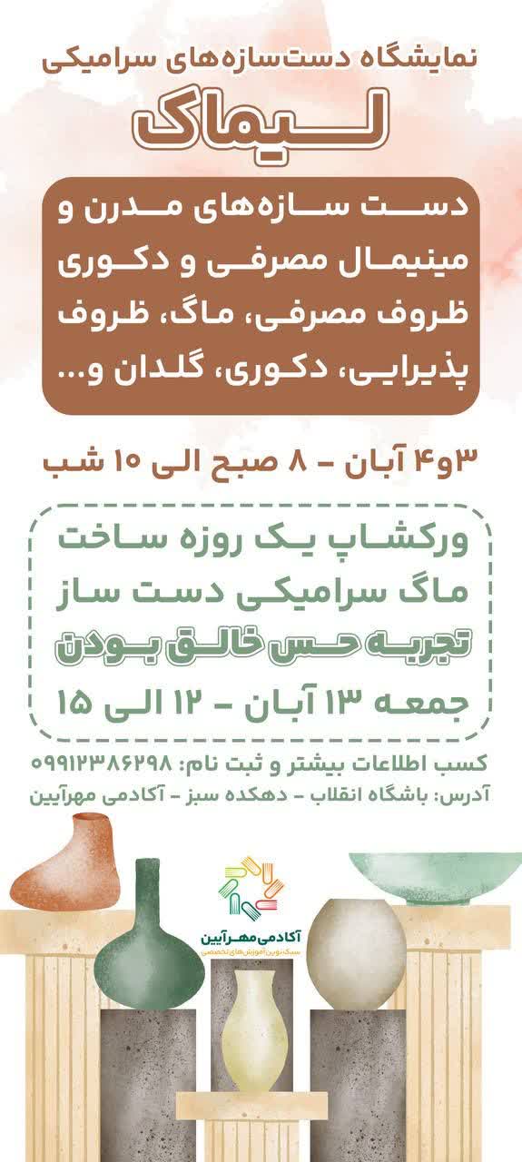 فرهنگی وهنری نمایشگاه دست سازه های سرامیکی لیماک ارسال شده توسط مهرآیین ۱۴۰۴-۰۴-۲۴ در ۱۴۰۳-۱۱-۱۶ نمایشگاه دست سازه های سرامیکی لیماکپنجشنبه و جمعه ۳ و ۴ آبان۸ صبح الی ۱۰ شبورکشاپ آموزشی ساخت ماگ به زودیدر آکادمی مهرآیین برگزار خواهدشد.